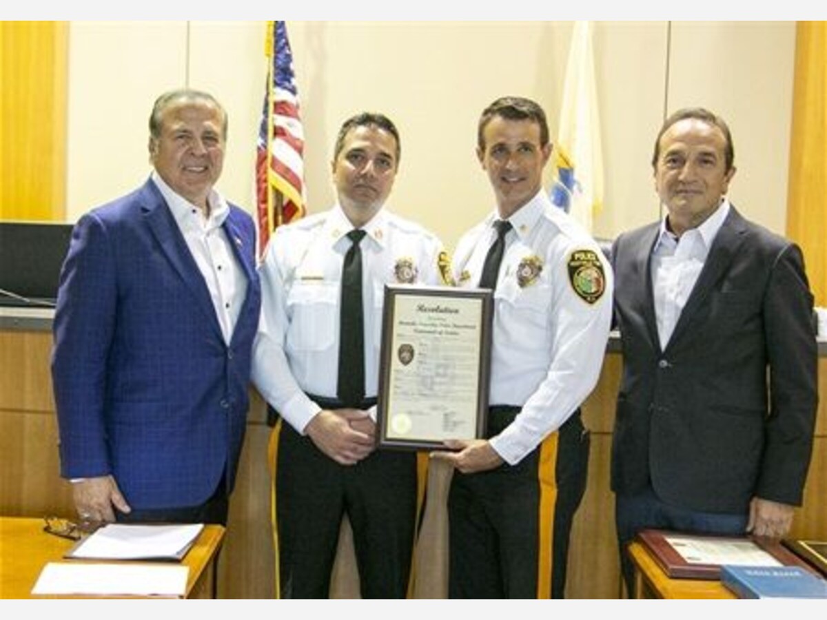 Commissioner Director Tayfun Selen and Commissioner Thomas Mastrangelo presented a formal resolution of honor to Chief Andrew Caggiano, recognizing a century of service by the department and congratulating the chief on his recent appointment as president of the New Jersey State Association of Chiefs of Police.