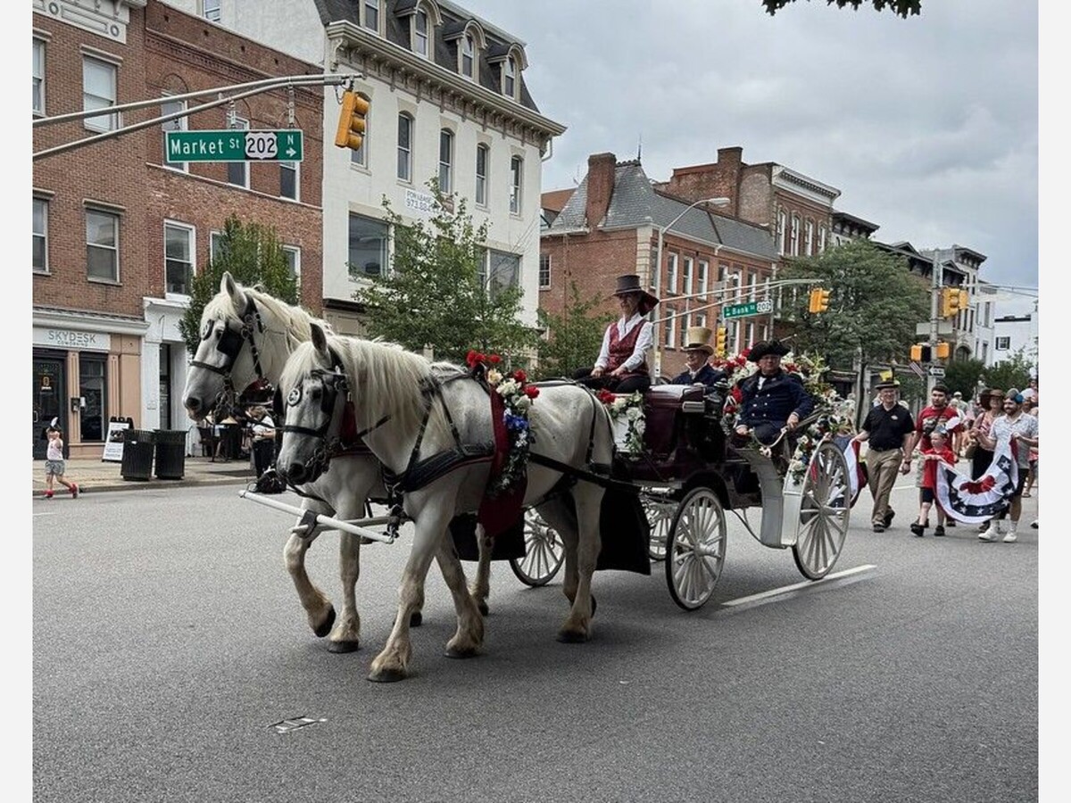 Touring Morristown in the back of a horse drawn carriage driven by Kathy Sperduto of KV Carriage, is Gen. Lafayette portrayed by Michael Halbert (left) and Gen. Doughty portrayed by Ryan Dawson (right).The spirit of 1825 returned to Morristown on Sunday, as Morris County and local officials joined residents, special guests and history enthusiasts in a series of events to honor the bicentennial of Gen. Marquis de Lafayette’s Farewell Tour in the United States.