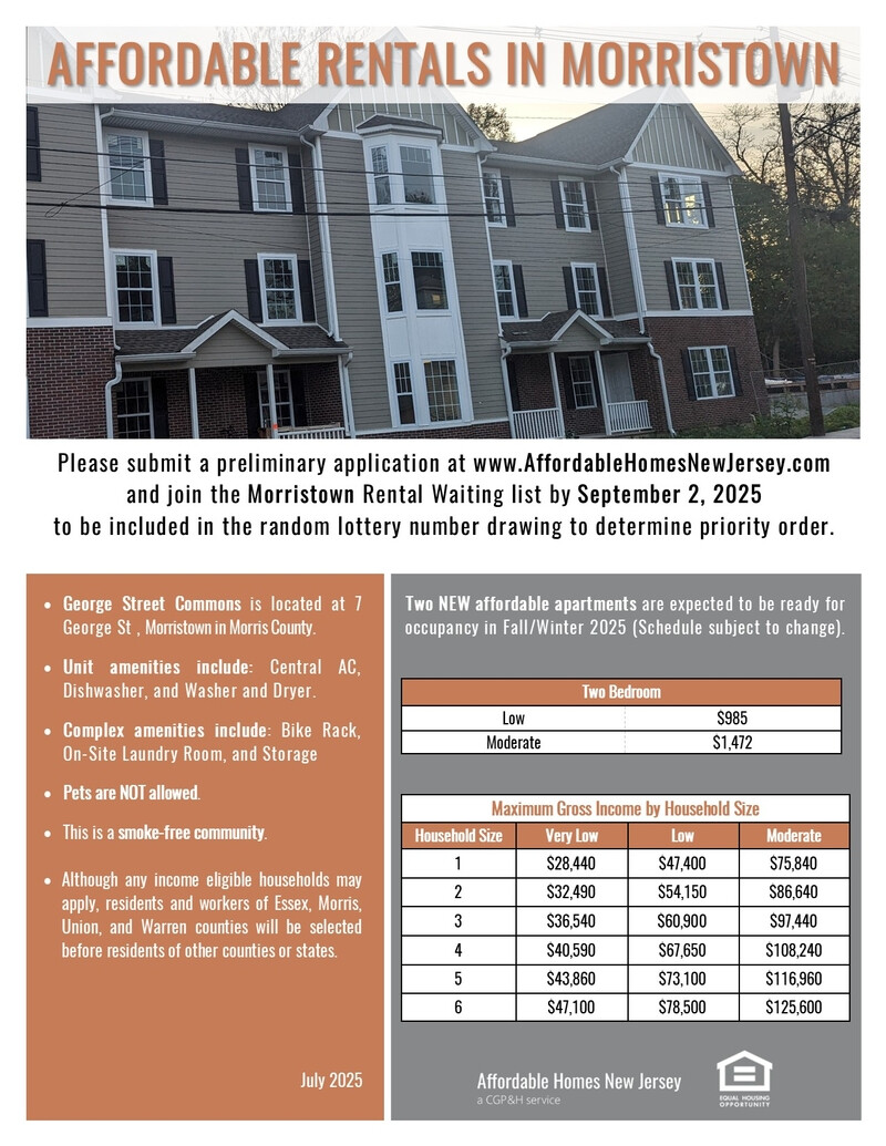 Submit a preliminary application at www.affordablehomesnewjersey.com and join the Morristown Rental Waiting list by September 2, 2025 to be included in the random lottery number drwing to determine priority order.