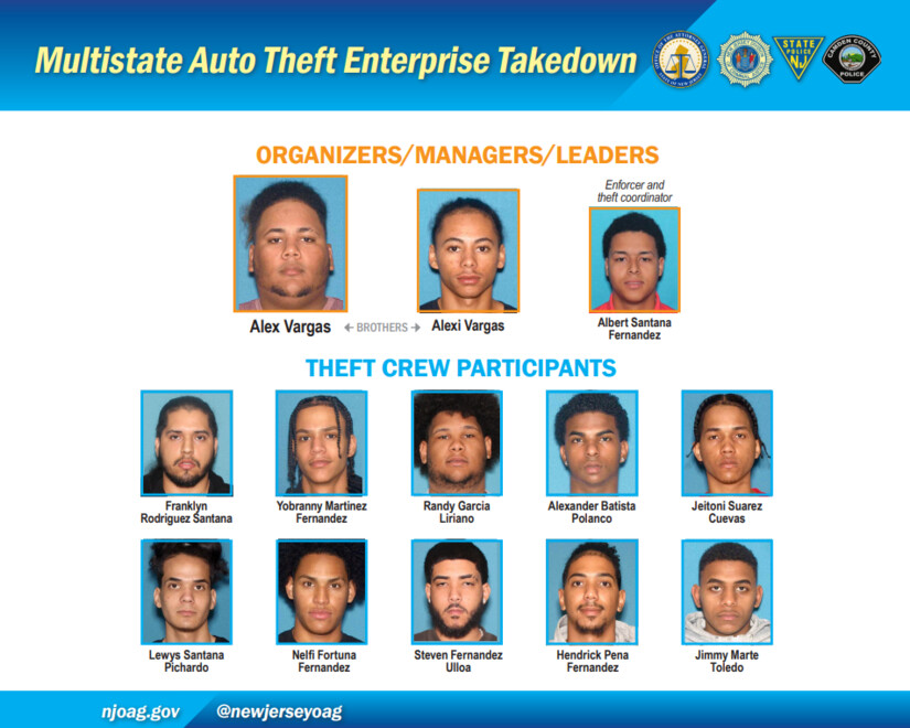 The alleged criminal enterprise was led by brothers Alex Vargas, 27, of Camden, and Alexi Vargas, 24, of Pennsauken, who are accused of orchestrating the theft of vehicles from dealerships and parking lots across seven New Jersey counties—including Burlington, Somerset, Bergen, Union, Mercer, Essex, and Camden—as well as in Pennsylvania, New York, and Delaware.