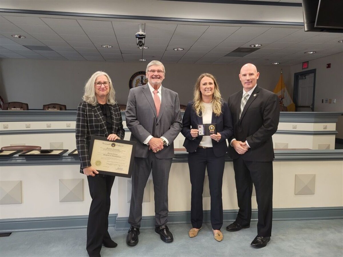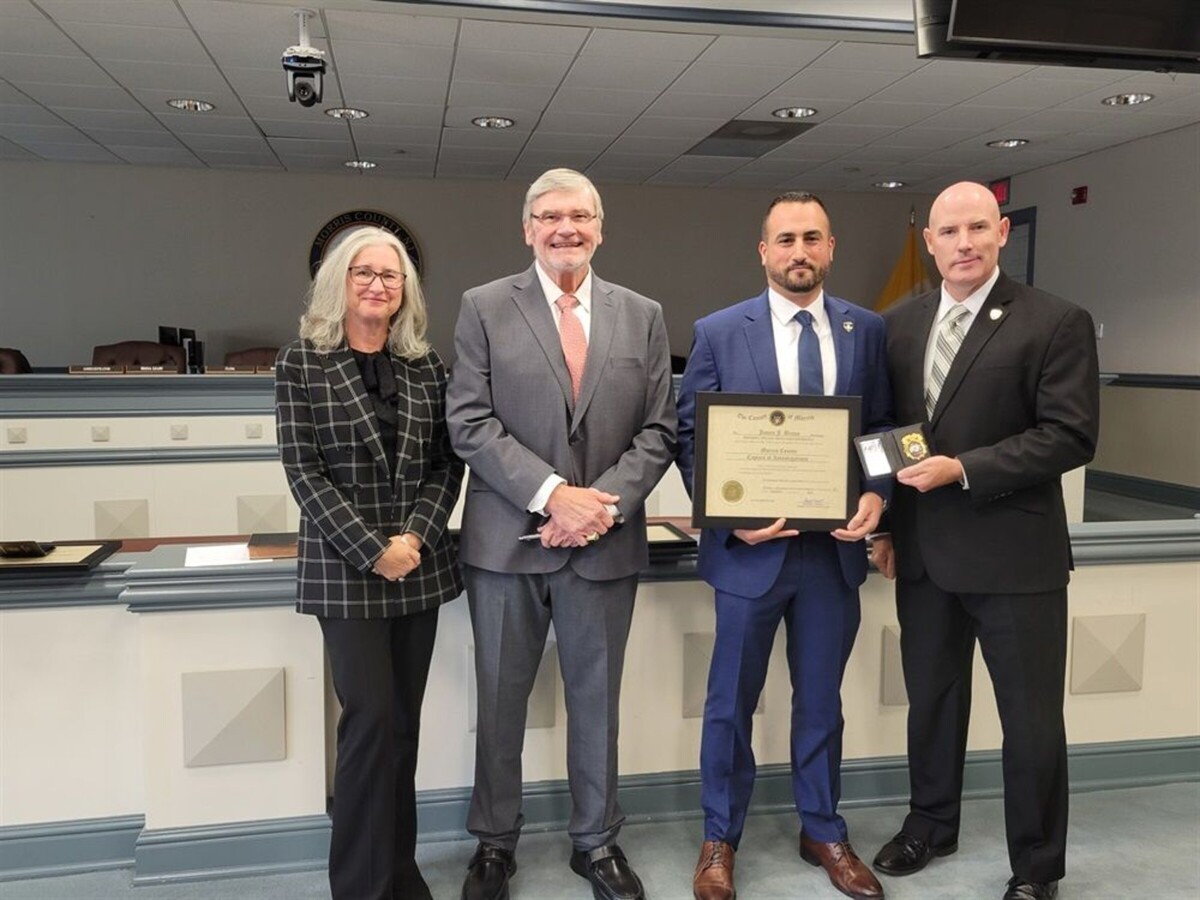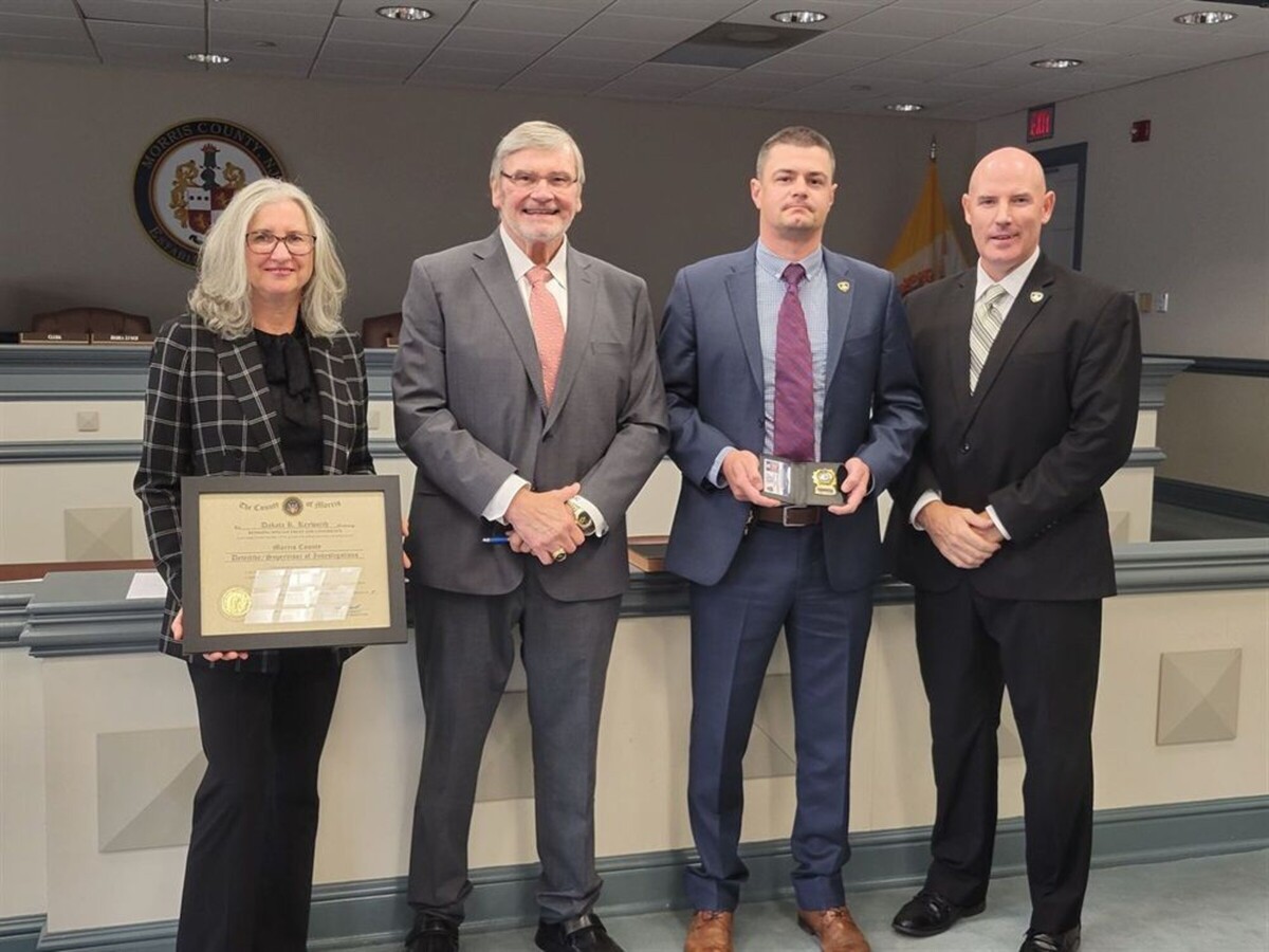 Morris County Prosecutor Robert J. Carroll, First Assistant Prosecutor Maggie Calderwood, and Chief of Detectives Robert McNally announce the promotion of eight members of the agency’s investigative team. A formal ceremony was held on September 10, 2025, at the Commissioners Public Meeting Room.