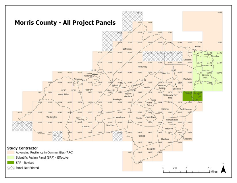 The revised pFIRMs and FIS do not include changes to most waterways reviewed through the Scientific Resolution Panels (SRP) process, which became effective Aug. 19, 2025. Those SRP-effective areas are shown in light green on the “Morris County -- All Projects Panels” graphic included with this release.