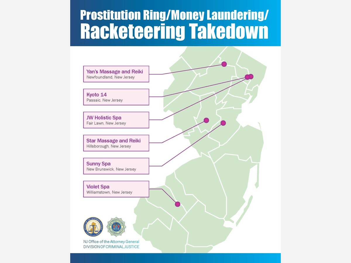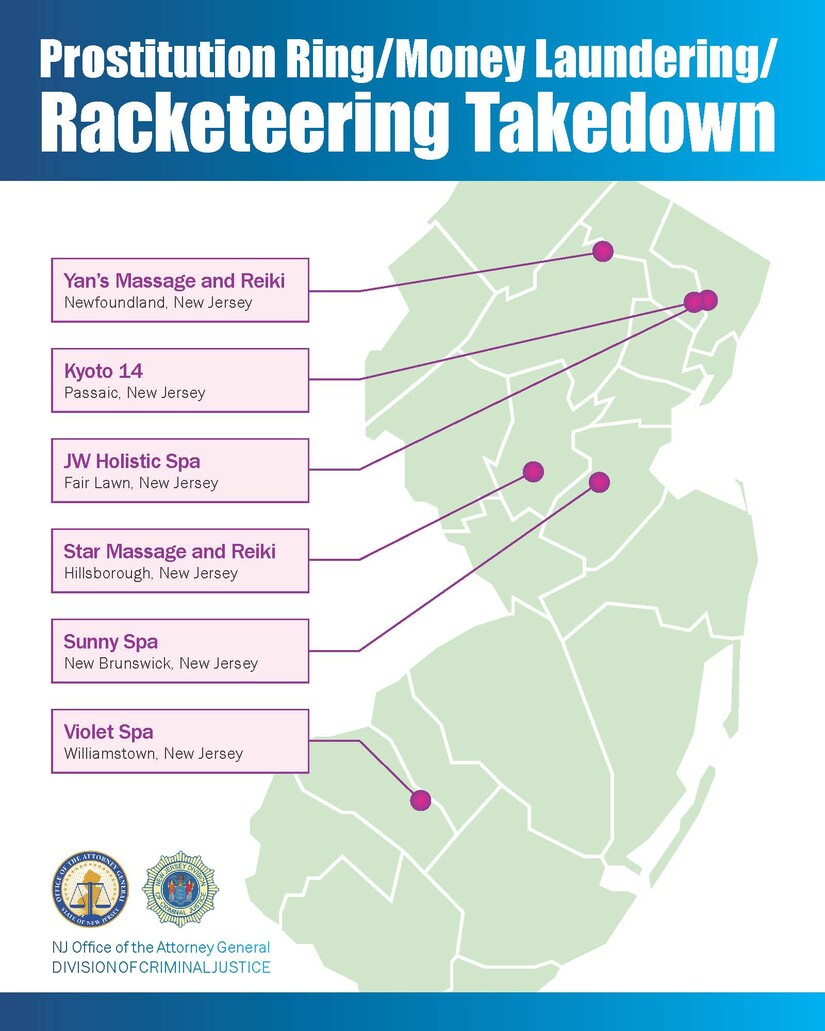Authorities allege organized prostitution ring operated spas in at least five New Jersey counties, generating over $500K in illicit proceeds
