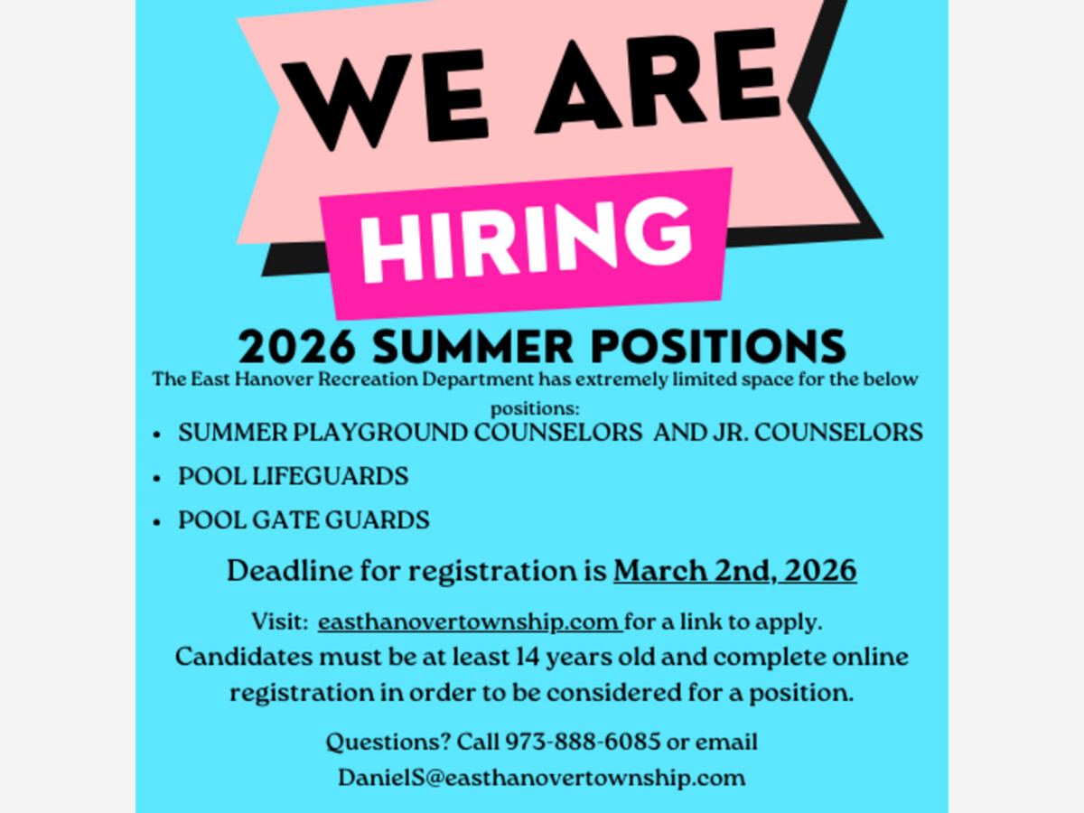 Looking for a fun and rewarding job this summer? The East Hanover Recreation Department is now accepting applications for several seasonal positions!